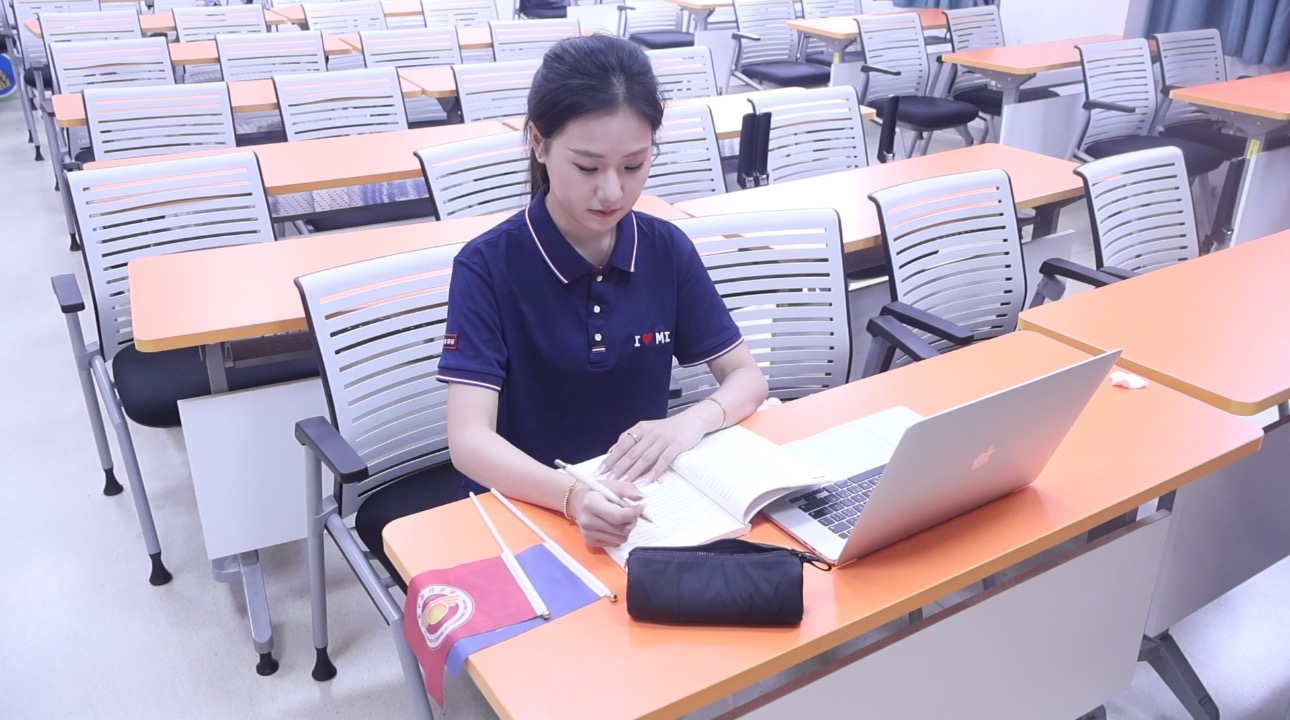 在校园的教学楼自习室,阳光如金箔般洒在课桌和少女身上,她埋首书海,笔尖划过纸页,那写出的一笔一画,是她眼中祖国的注脚——那是图书馆里典藏的前沿著作的滋养,是把专业学扎实、把视野拓开阔的底气。当她轻轻拿起角落折叠整齐的小国旗,阳光让五角星熠熠生辉,这抹光,是知识土壤里长出的逐梦力量,是青春中国奋斗最动人的模样。