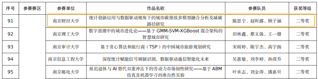 10月26日,2025年(第十一届)全国大学生统计建模大赛全国总决赛在东北财经大学落下帷幕。我们陈思宇、赵昕露、顾子涵三位同学在张志旺老师的精心指导下,参赛作品《统计创新应用与数据驱动视角下的城市碳排放多模型融合分析及减碳路径研究》经过通讯评审、会议评审和现场答辩,最终荣获国赛二等奖。